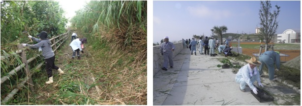 - 具体的には、ハンタ道、世界遺産中城城跡のツワブキの植栽による美化、またハンタ道道中や中城城内及び城壁石垣の清掃、草刈が活動の一環でもある。