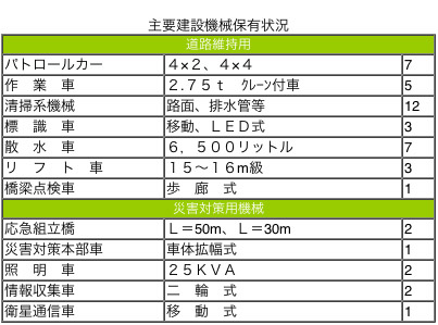 建設機械整備事業としては、道路の維持管理に必要な機械の購入・運用管理を図る。また、地震や台風などの災害対策用機械の購入運用管理を図ると共に、それらの機械の改良や技術開発を行う。