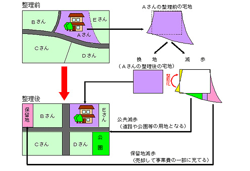 土地区画整理法第2条に「都市計画区域内の土地について、公共施設の整備改善及び宅地の利用の増進を図る為、(中略)土地の区画形質の変更及び公共施設の新設又は変更に関する事業」と定義され、同法第1条に「健全な市街地の造成を図り、もって公共の福祉の増進に資すること」とその目的が定められている。