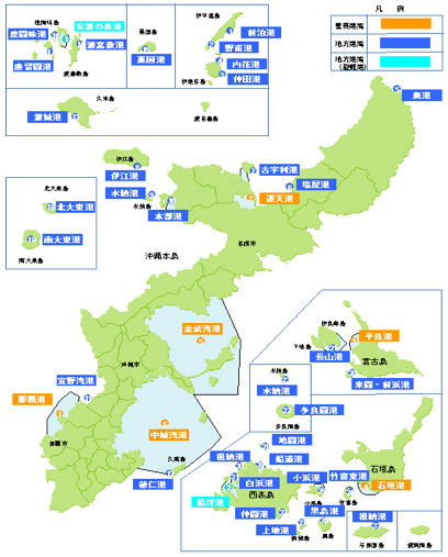このため人的・物的輸送については海上輸送に依存するところが大きく、さらには観光産業などの振興の上でも港湾の果たす役割は極めて重要となっている。現在沖縄には、重要港湾6港・地方港湾35港(うち避難港2港)・合計41港の港湾がある。