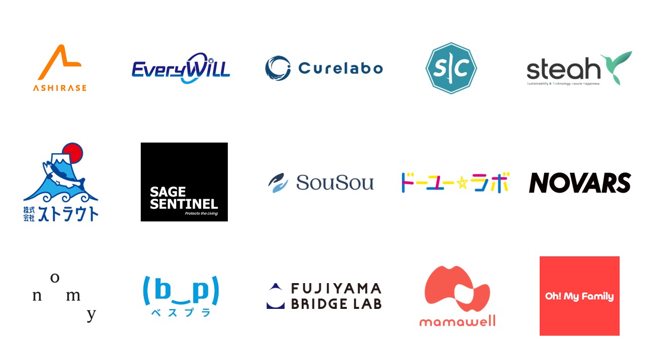 左上から、Ashirase株式会社、株式会社Every WiLL、Curelabo株式会社、有限会社シューコーポレーション、株式会社STEAH、株式会社ストラウト、Sage-Sentinel Smart Solutions株式会社、株式会社そうそう、DYL株式会社、ノバルス株式会社、NoMy Japan株式会社、株式会社ベスプラ、FUJIYAMA BRIDGE LAB株式会社、株式会社MamaWell、株式会社OhMyFamily ※順不同