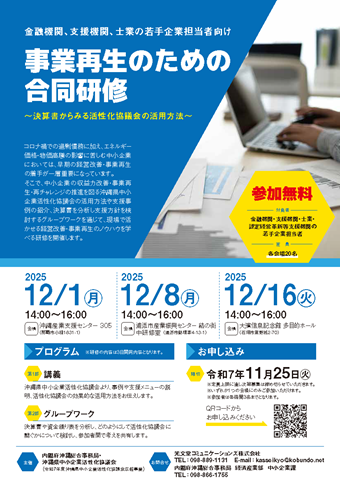 内閣府沖縄総合事務局経済産業部中小企業課では、中小企業の収益力改善・事業再生・再チャレンジの推進を図る沖縄県中小企業活性化協議会の活用方法や支援事例の紹介、決算書等を分析し支援方針を検討するグループワークを通じて、金融機関・支援機関・士業の若手企業担当者が現場で活かせる経営改善・事業再生のノウハウを学べる研修を、那覇市・浦添市・石垣市にて開催いたします。