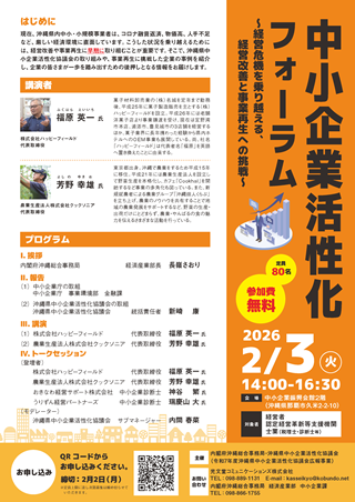 現在、沖縄県内中小・小規模事業者は、コロナ融資返済、物価高、人手不足など、厳しい経済環境に直面しています。こうした状況を乗り越えるためには、経営改善や事業再生に早期に取り組むことが重要です。そこで、沖縄県中小企業活性化協議会の取り組みや、事業再生に挑戦した企業の事例を紹介し、企業の皆さまが一歩を踏み出すための後押しとなる情報をお届けします。