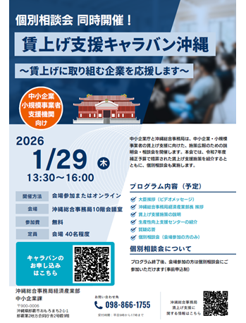 中小企業庁と沖縄総合事務局は、中小企業・小規模事業者の賃上げ支援に向けた、施策広報のための説明会・相談会を開催します。