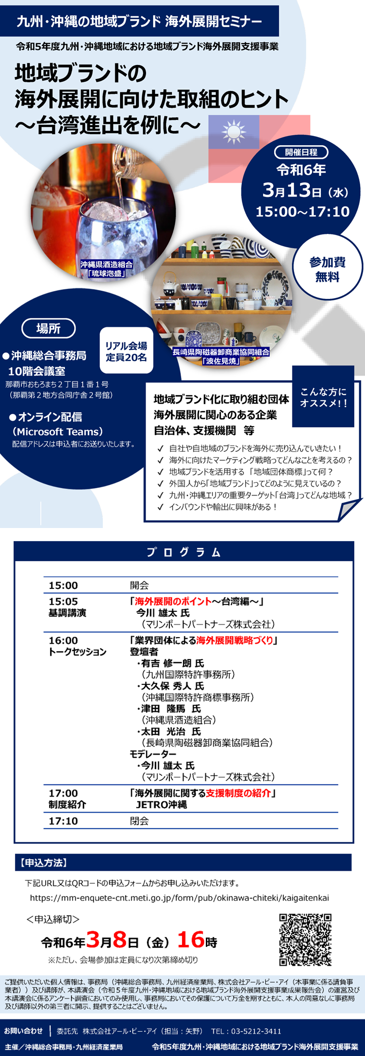 15:00 開会 15:05 基調講演 「海外展開のポイント~台湾編~」 今川雄太氏(マリンポートパートナーズ株式会社) 16:00 トークセッション「業界団体による海外展開戦略づくり」 登壇者 ・有吉修一朗氏(九州国際特許事務所) ・大久保秀人氏(沖縄国際特許商標事務所) ・津田隆馬氏(沖縄県酒造組合) ・太田光治氏(長崎県陶磁器卸商業協同組合) モデレーター ・今川雄太氏(マリンポートパートナーズ株式会社) 17:00 制度紹介「海外展開に関する支援制度の紹介」 JETRO沖縄 17:10 閉会 詳細は 開催案内チラシをご確認ください。 |