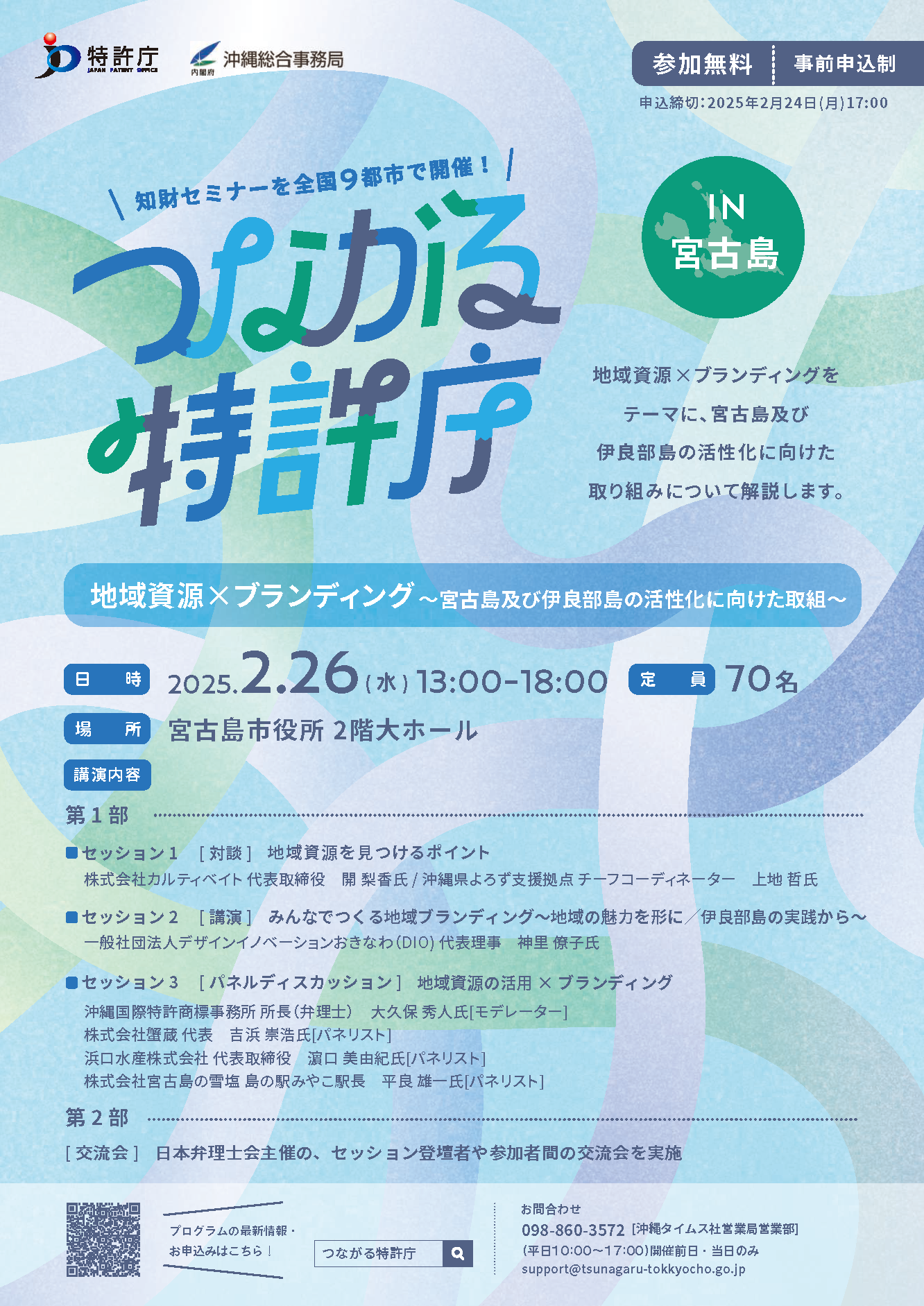 沖縄総合事務局は特許庁と主催で、「地域資源×ブランディング」をメインテーマに宮古島及び伊良部島の活性化に向けた取り組みを紹介しながら、地域資源を活用したブランディング戦略について解説する「つながる特許庁in宮古島」を開催します。地域資源の活用をお考えの皆様のヒントになる情報が満載です。 全国9都市で地域と特許庁を結ぶイベント「つながる特許庁」は、知的財産の活用によるビジネスチャンスの拡大をサポートします。 *スマートフォンなどから開くときは こちら(PNG) |