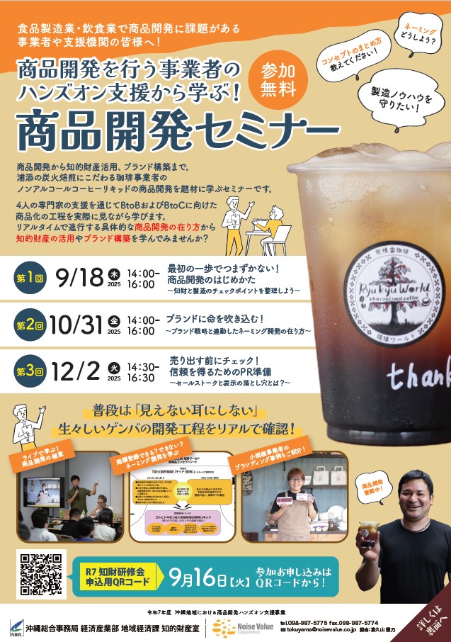 沖縄地域における商品開発ハンズオン支援事業(知財経営支援促進事業)では、企業の商品開発、既存商品の改良について、課題抽出、解決策の検討、試作品の検討、商品のプロモーションまでのフェーズごとの支援及び当該フェーズごとに必要となる知的財産の保護や活用について、企業に対しハンズオンによる支援を実施し、企業における知的財産の重要性の理解及び知的財産を強みとして活かした経営を強化し、稼ぐ力の向上につなげることを目的としております。 本研修会は、専門家4人が実際に支援を行っている珈琲事業者の商品開発を題材として、具体的な商品開発の在り方から知的財産の活用、ブランド構築まで学べるセミナーとなっています。実際に商品開発を行っている事業者や、日頃から商品開発を行っている事業者を支援している支援機関においても参考となる内容となっておりますので、是非ご参加ください。 募集チラシ(PDF) |
