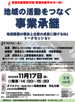 事業承継啓発月間メインイベント 地域の活動をつなぐ事業承継 ~地域課題の解決と企業の成長につなげるM&Aトークセッション~ を開催します!