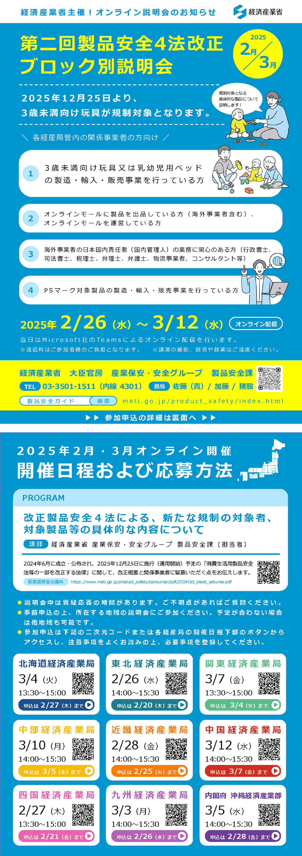 ○日時 2025年3月5日(水)14時00分~15時30分 ○開催方法 オンライン配信(Microsoft Teams) ○対象者 ・3歳未満向け玩具又は乳幼児用ベッドの製造・輸入・販売事業を行っている方 ・オンラインモールに製品を出品している方(海外事業者含む)、オンラインモールを 運営している方 ・海外事業者の日本国内責任者(国内管理人)の業務に関心のある方(行政書士、司法 書士、税理士、弁理士、弁護士、物流事業者、コンサルタント等) ・PSマーク対象製品の製造・輸入・販売事業を行っている方 ○参加費 無料 ○概要 「改正製品安全4法による、新たな規制の対象者、対象製品等の具体的な内容について」 説明者:経済産業省 産業保安・安全グループ 製品安全課 ※予定が合わない場合は他地域の説明会にもご参加いただけます。 詳しくはチラシをご覧ください。 セミナー案内チラシ(PDF) ※スマートフォンなどから開く場合は こちら(PNG) |