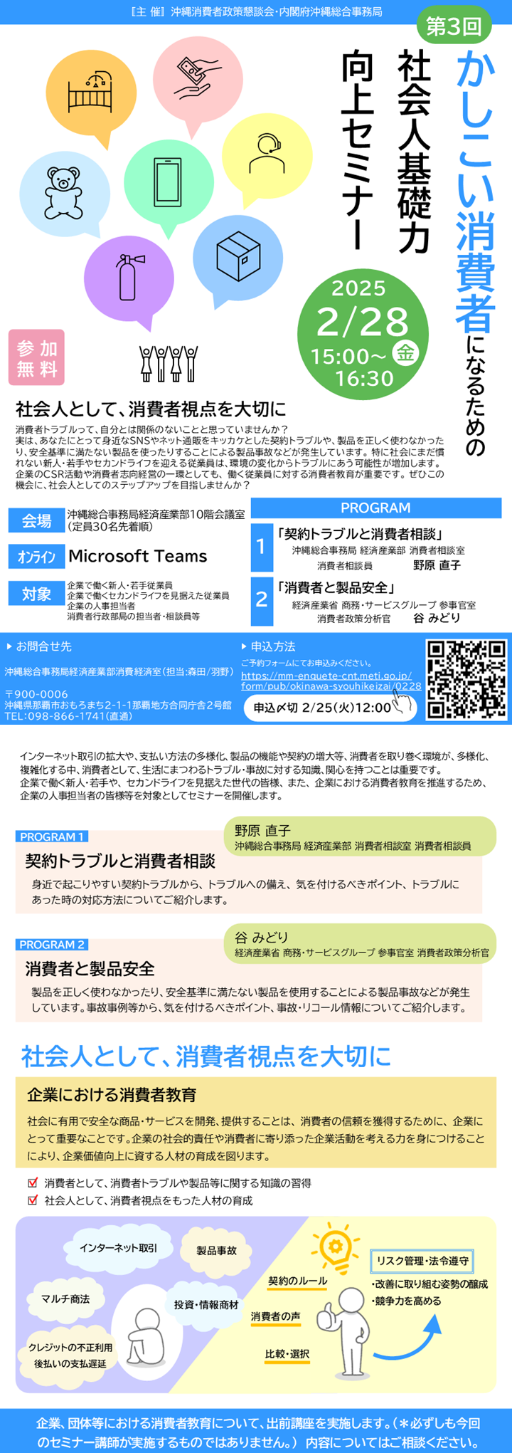 ○日時 令和7年2月28日(金)15:00~(1時間半程度) ○参加方法 会場:沖縄総合事務局10階会議室(※定員30名) オンライン:Microsoft Teams ○参加費 無料 セミナー案内チラシ(PDF) ※スマートフォンなどから開く場合は こちら(PNG) |