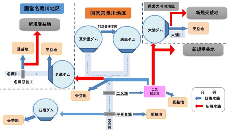 本事業では、石垣島北部・西部の水源未整備地域へ農業用水を供給するため、底原ダム・真栄里ダムの農業用水を名蔵ダム及び大浦ダムに補給するダム間送水を行います。