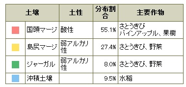 沖縄県の土壌は、国頭マージが最も多く、次いで島尻マージ、ジャーガル、沖積土壌の順となっています。これらの土壌は、沖縄の気候・地質・地形条件等により生成された特徴的な土壌で、母材や有機物の分解が早いため一般的には有機物が乏しく、粘土質に富む風化土あるいは風化岩の堆積土です。そのため、物理性・理化学性からして良好な耕土とは言い難く、それぞれ改良を必要とする特殊土壌と言えます。