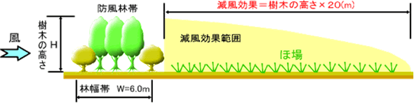 防風林が風を和らげる効果は、一般的に樹木の高さHに対して、風下側に20倍程度とされています。例えば、防風林の高さが5mだとすると100m先の畑まで防風効果があることとなります。