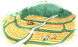 等高線に沿ってあぜ(畑と畑の境界)をつくることで、斜面の上から流れる水の速度を緩やかにし、土壌の流出を防ぐことができます。