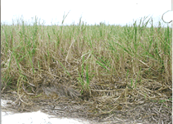 台風により倒伏し、潮害で枯れ上がっ 防風林により潮害を受けなかったため たサトウキビ 青葉が多いサトウキビ 〇