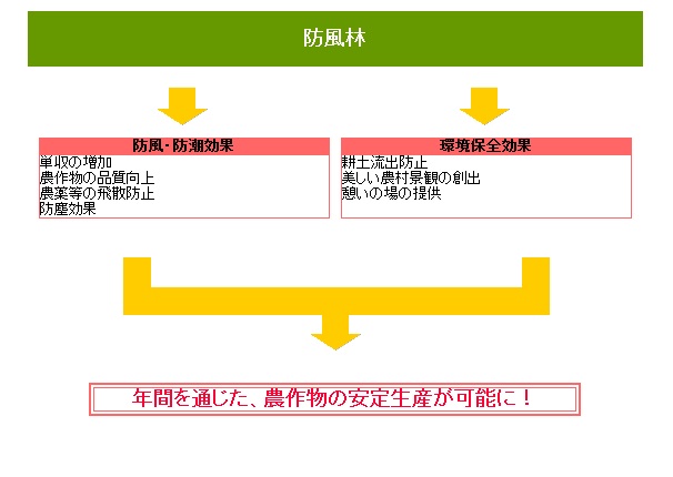 防風林とは、台風や季節風による風を分散することで周辺の風の力を弱め、農地の被害を軽減する目的のために造成・維持される森林のことです。