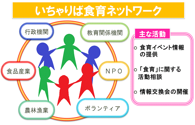 沖縄総合事務局では、地域で食育活動に取り組んでいる団体、企業、個人等幅広い分野の方々と連携・協力、情報交換を通じて、食育の輪をさらに広げ、より多くの方々の活動を促進させることを目的に、「いちゃりば食育ネット」を平成17年に設立しました。