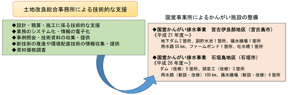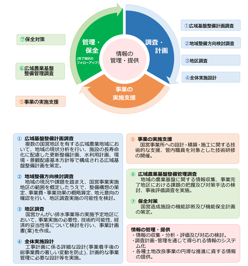 土地改良総合事務所では、①設計・積算・施工に係る技術的な支援、②システムの管理・運営、③研修等の実施を通じて、国営事業所での事業推進を支援しています。