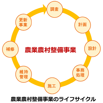 「事業総合支援システム」とは、農業農村整備事業の調査・計画段階から、事業の実施(設計・施工)、施設の維持管理、更新までのライフサイクル全体に関わる情報を統一的なフォーマットで電子化し、ネットワークを利用して効率的に交換・共有するためのシステムです。 土地改良総合事務所では、農業農村整備事業の透明性を確保し、効率化を進めるため、「事業総合支援システム」を導入し、その管理・運営を行っています。