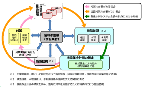 実施サイクル ストックマネジメントは、①管理者による適切な日常管理、②定期的な機能診断、③施設の劣化予測や工法等の比較検討による機能保全計画の作成、④同計画に基づく対策の実施、⑤これらの課程を通じて得られる施設状態や対策履歴等のデータの蓄積と利用等のサイクルを繰り返すことにより実施しています。 |