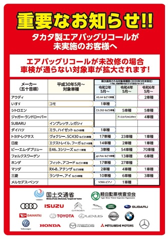 タカタ製エアバッグのリコール改修を促進するため、未改修車両を車検で通さない措置の対象車両を令和2年5月1日より順次拡大します。