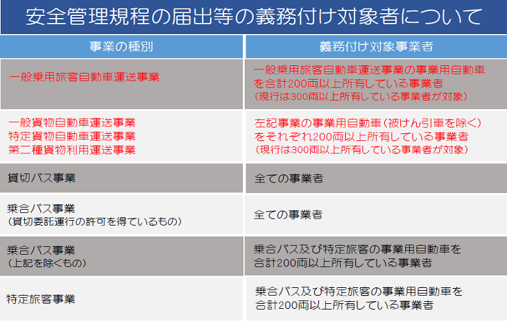これまで保有車両数300両以上のタクシー・トラック事業者に義務付けられていた安全管理規程の