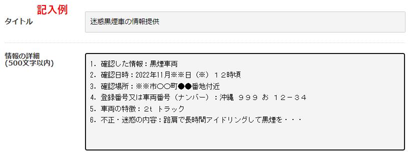 ④車両が特定できないなど必要な情報をお寄せいただけていない場合、又は、原動機付自転車、小型特殊自動車及び軽車両の場合は、情報として受付いたしかねますので、予めご了承ください。